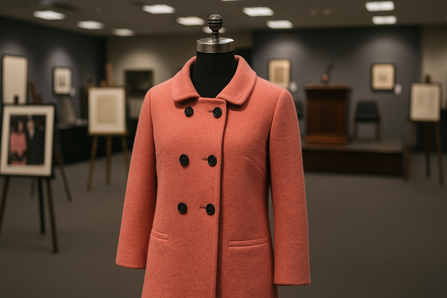 - Το παλτό είναι βιολετί, μάλλινο και ανήκε στη Ζακλίν Κένεντι Ωνάση.